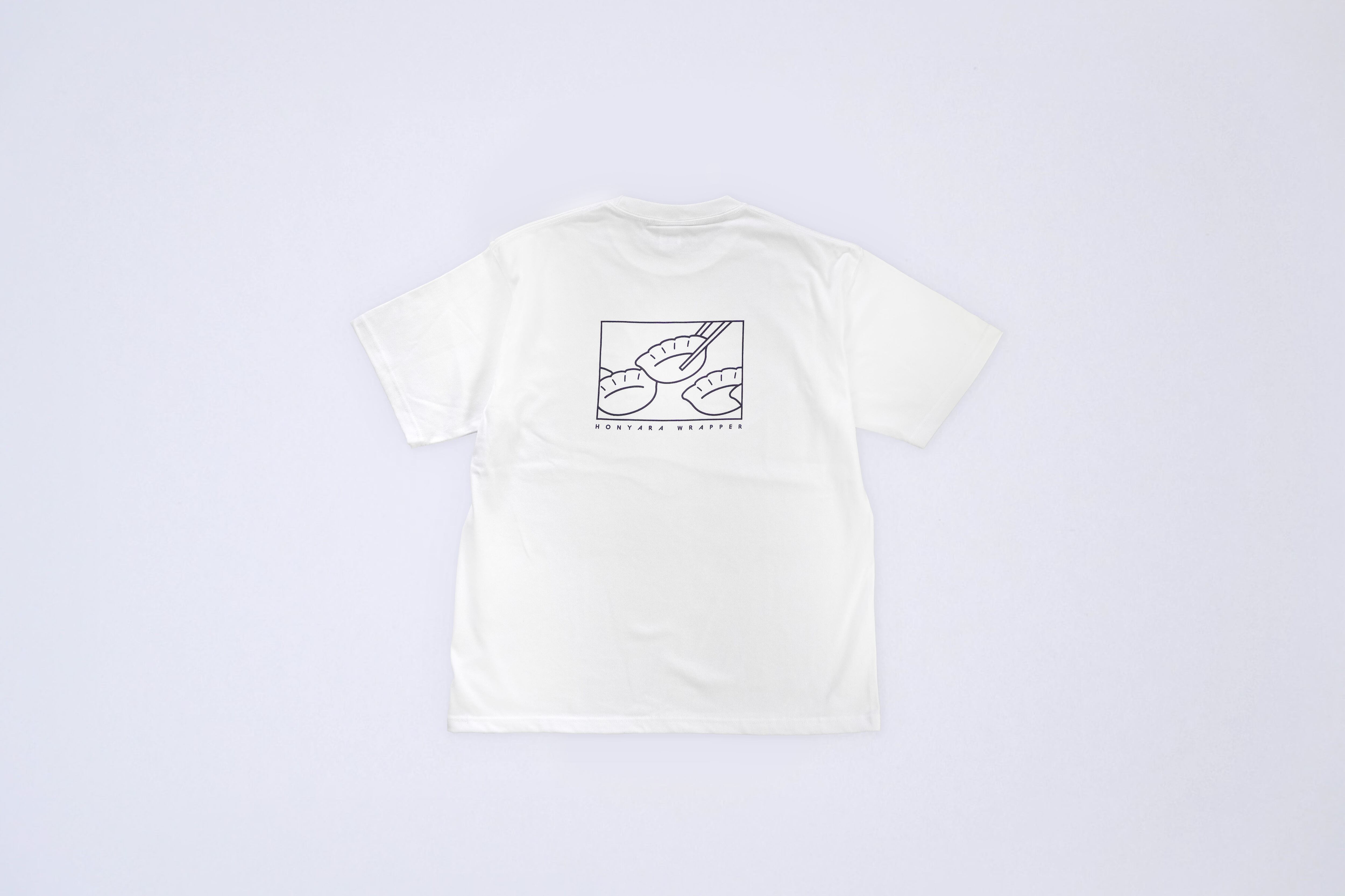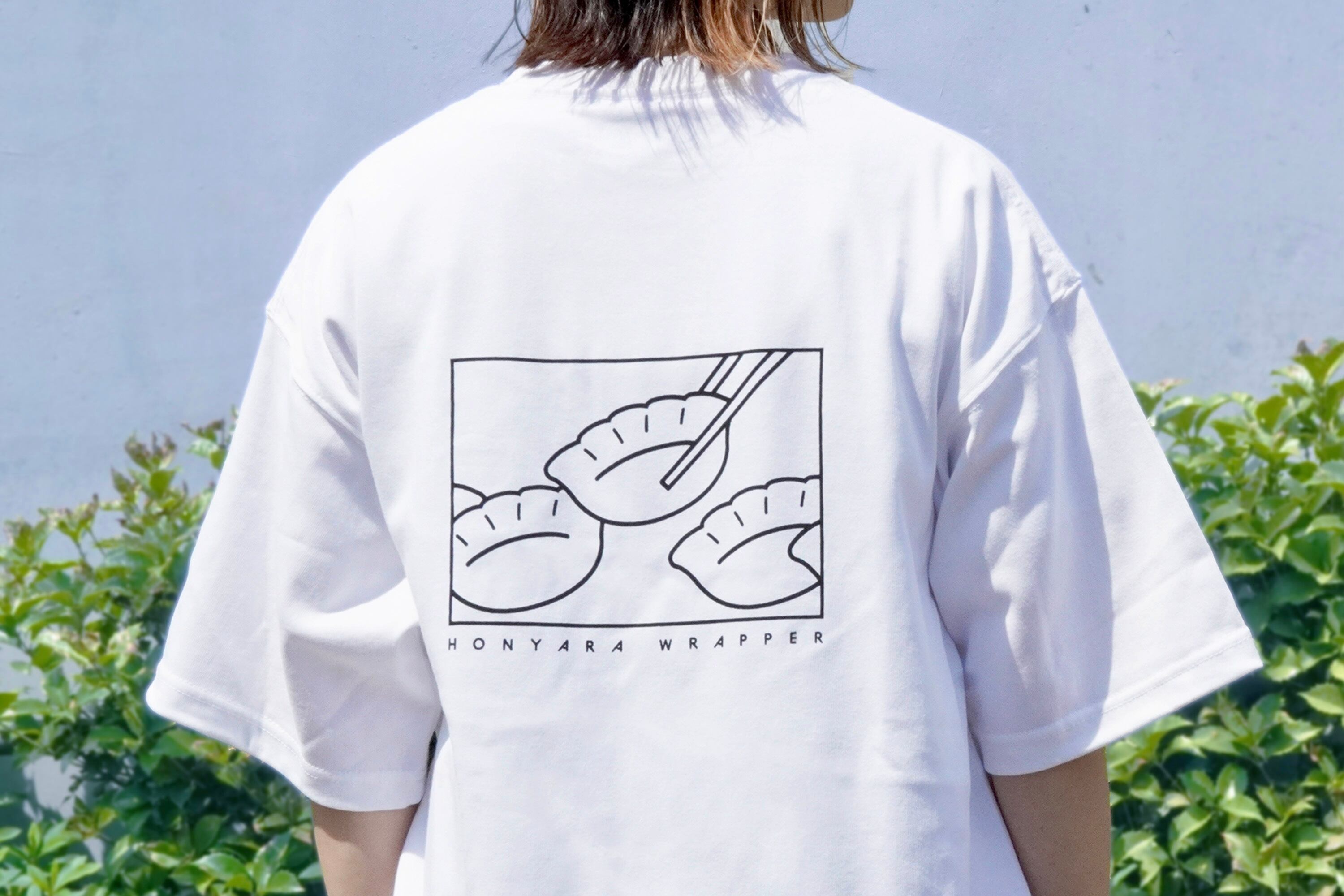 背中に箸でつままれる餃子のプリントが入ったTシャツ。