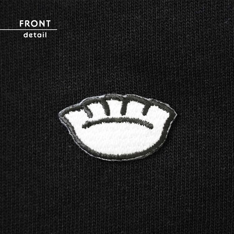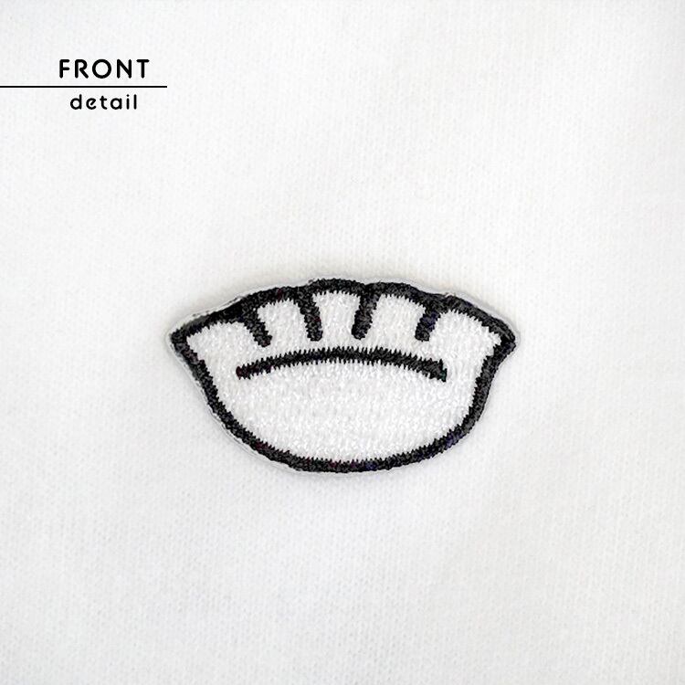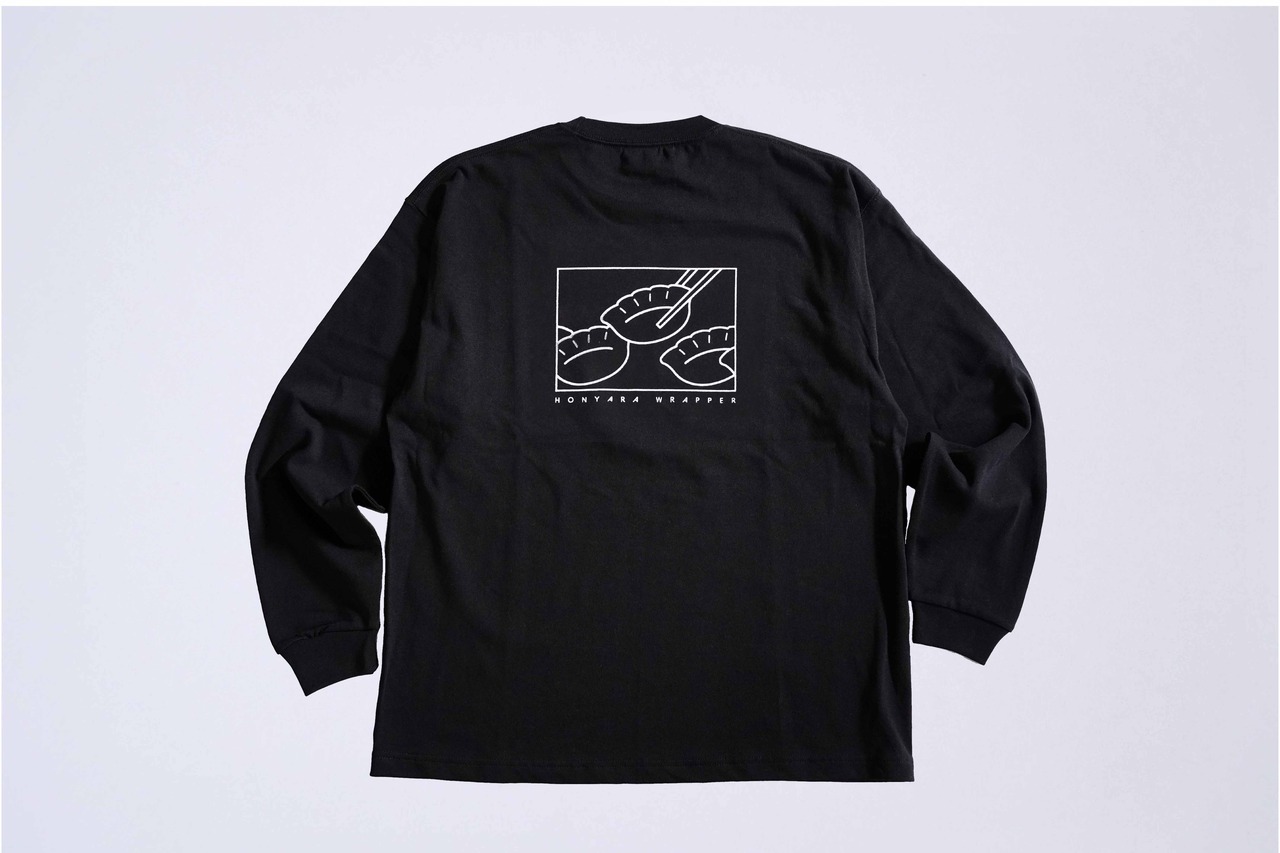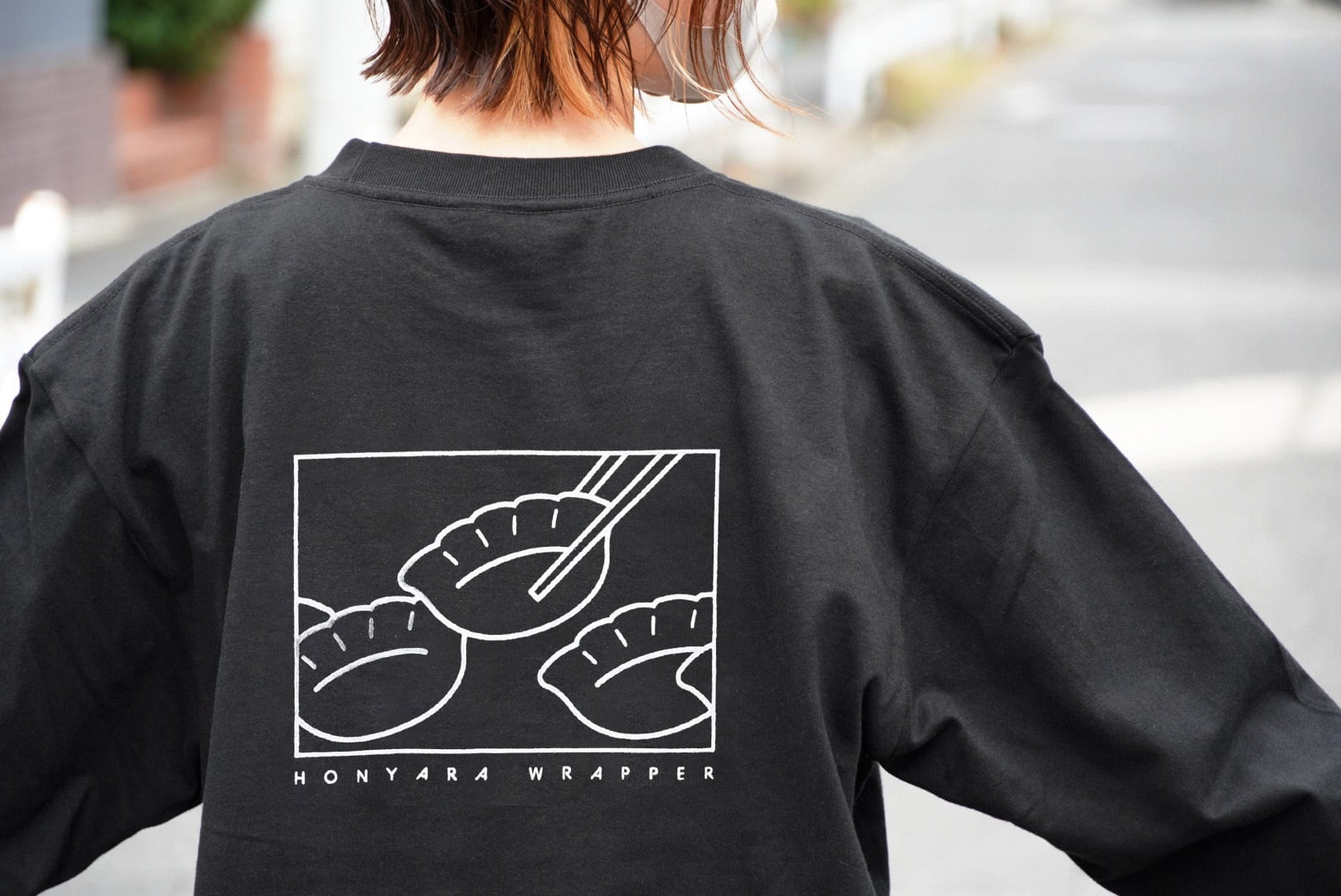 背中に箸でつままれる餃子のプリントが入ったロンT。