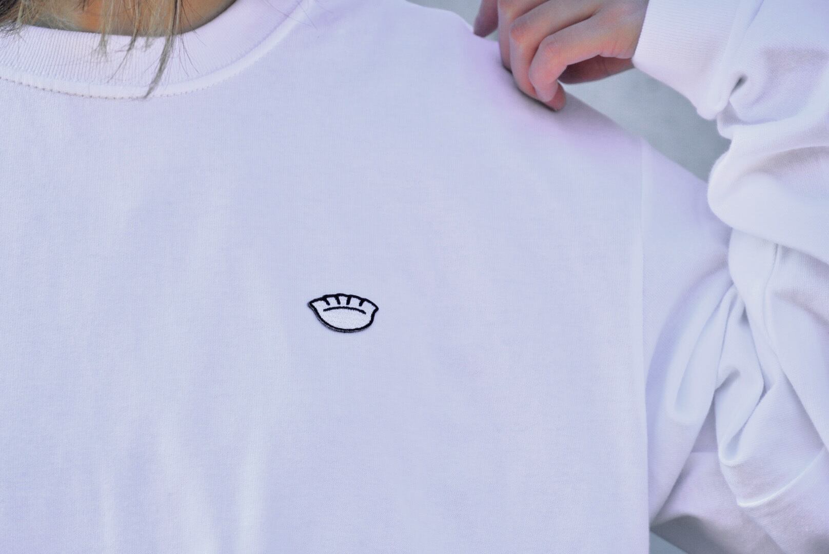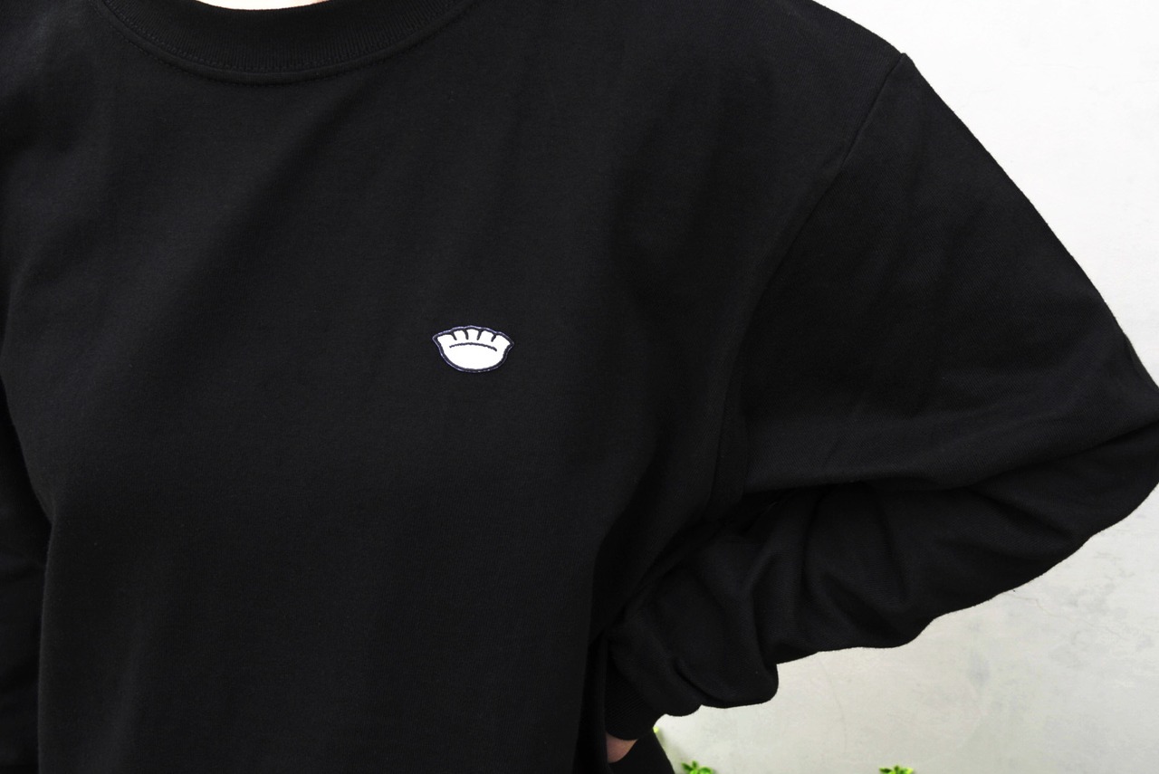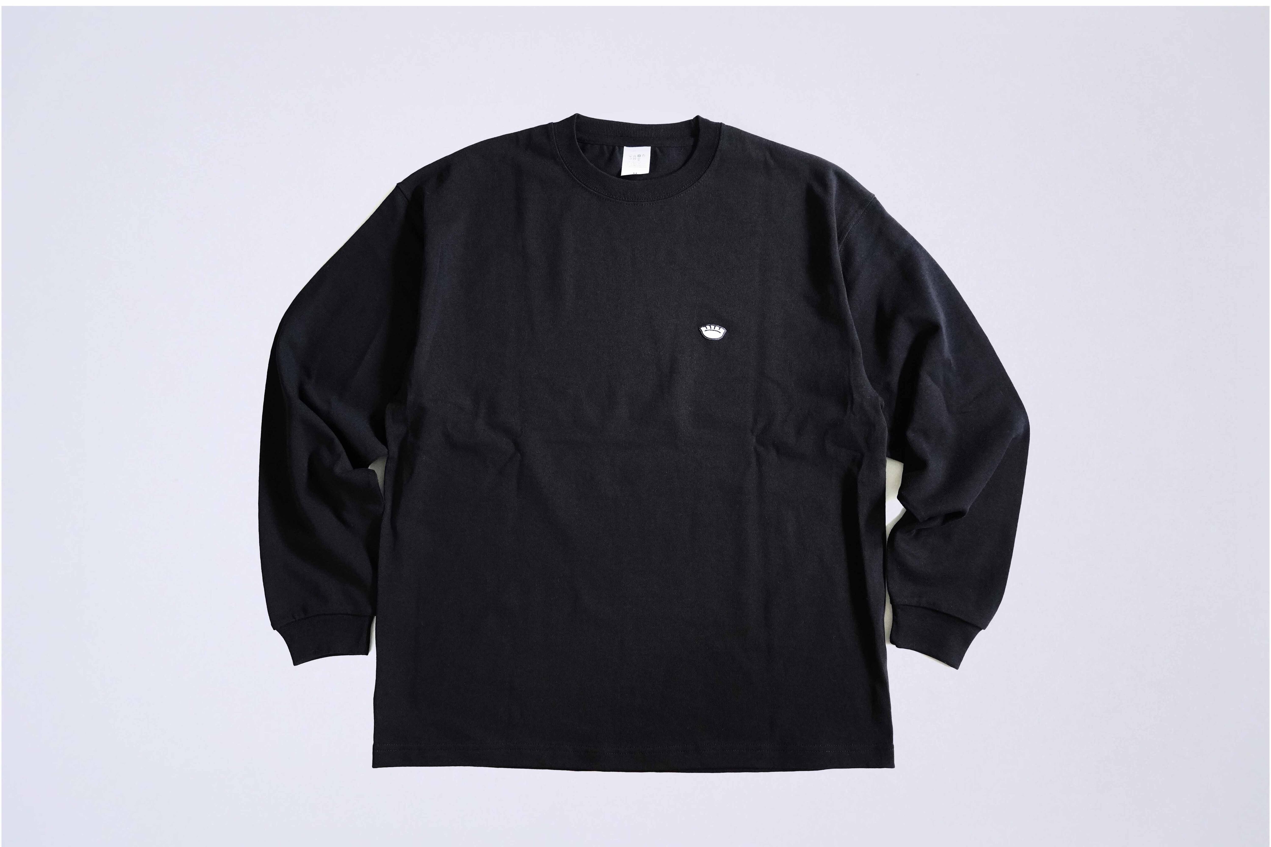 背中に箸でつままれる餃子のプリントが入ったロンT。